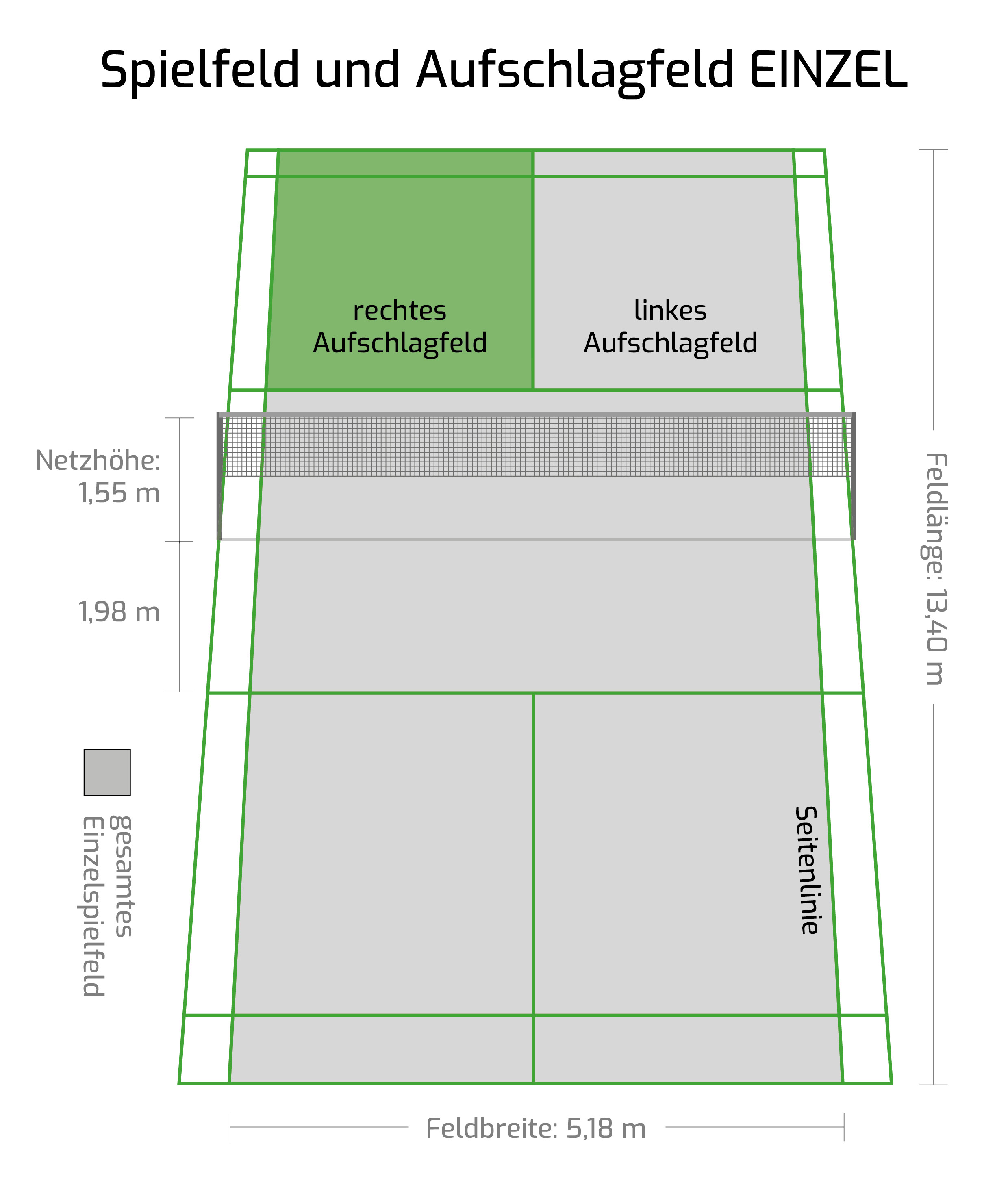 - Spielfeld-Maße: 13,40 m lang und 6,10 m breit
