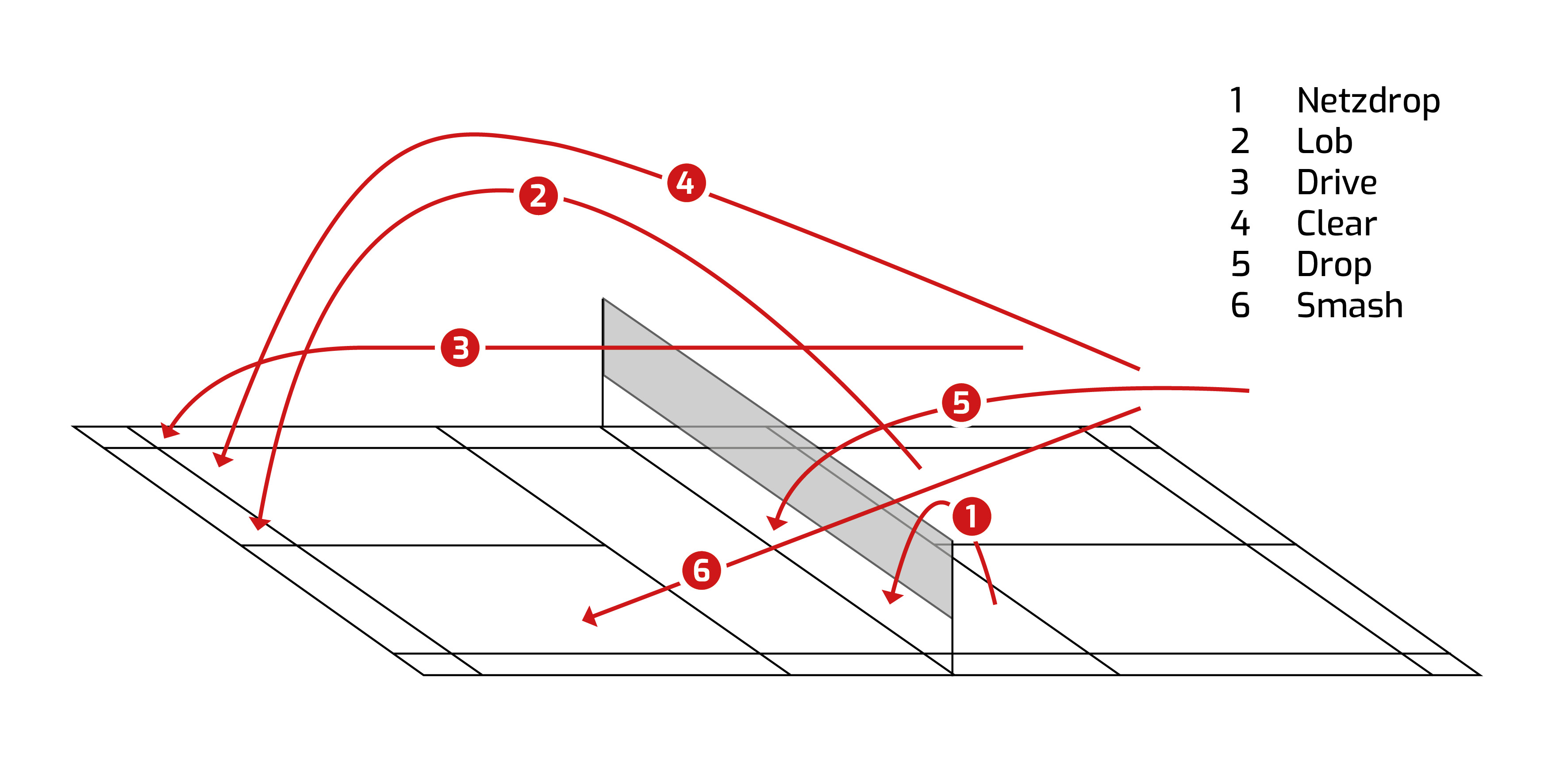 Kurzer Ball, der knapp hinter das Netz geschlagen wird. Bei dieser Art Stoppball ist die Effizienz am höchsten, wenn der Gegner weit hinten im Feld steht und man selbst einen Clear oder Smash antäuscht. - Netzdrop