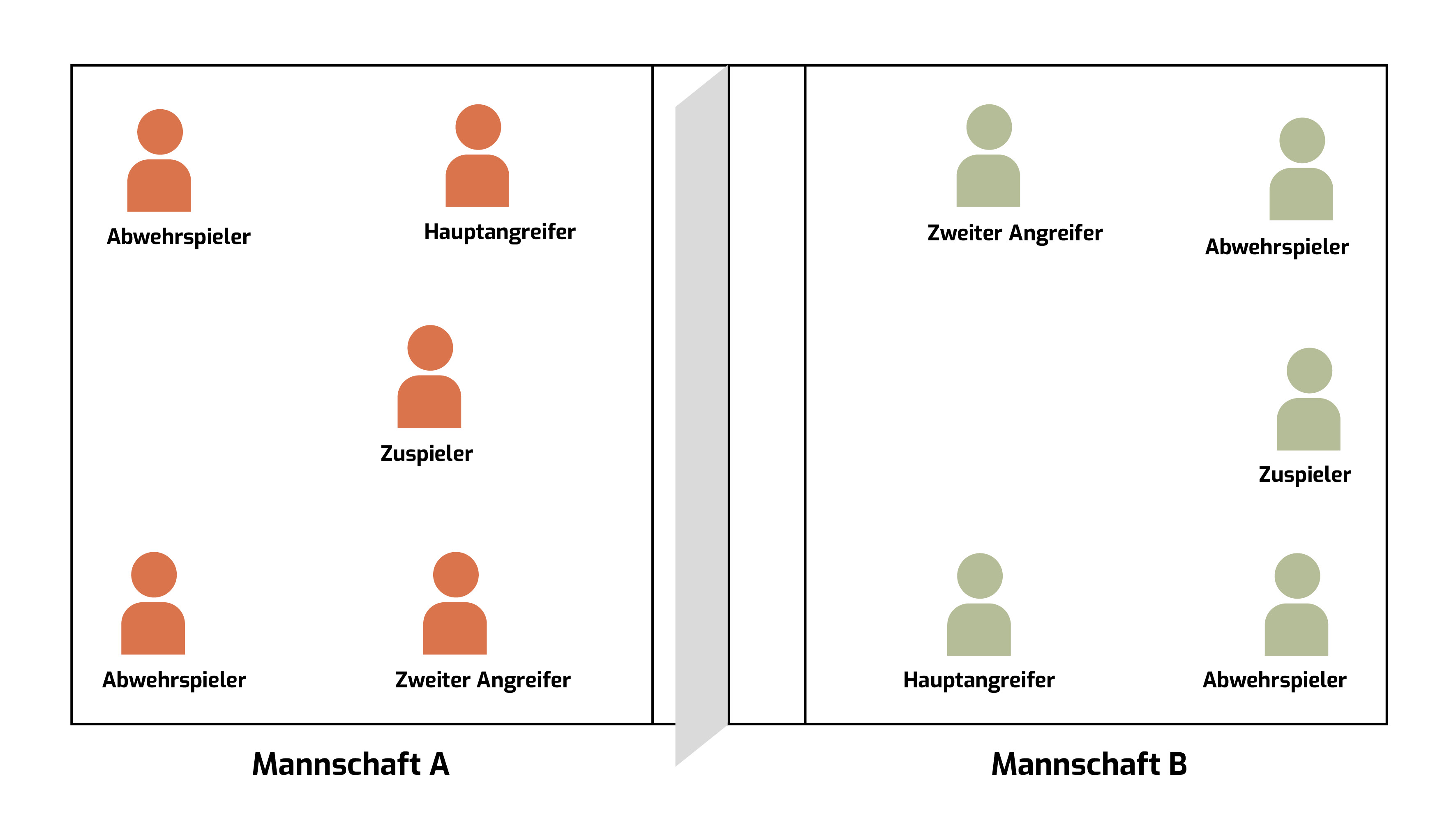 Mannschaft A zeigt die Aufstellung beim Feld-Faustball; Mannschaft B zeigt die Aufstellung beim Hallen-Faustball