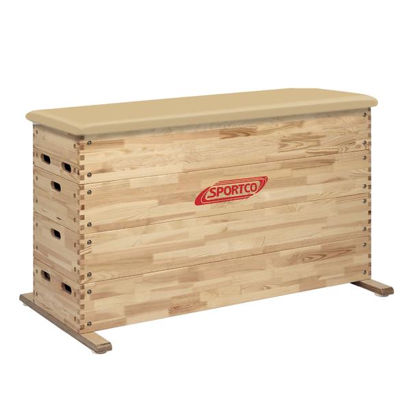 Der Sportco Sprungkasten CLASSIC ist als 4-teiliger, 5-teiliger oder 6-teiliger Kasten bestellbar. Je nach Einsatzbereich oder Übung werden unterschiedliche Anforderungen an einen Sprungkasten gestellt. Die mehrteiligen Sprungkästen lassen sich durch die Entnahme einzelner Kastenteile individuell in der Höhe einstellen. Das kleinste Höhenmaß ist die Kombination aus Unterteil mit dem gepolsterten Deckelbrett. Der Sprungkasten CLASSIC zeichnet sich durch eine hervorragende Stabilität und Langlebigkeit aus. Bestellen Sie noch heute Ihren neuen Sprungkasten CLASSIC!