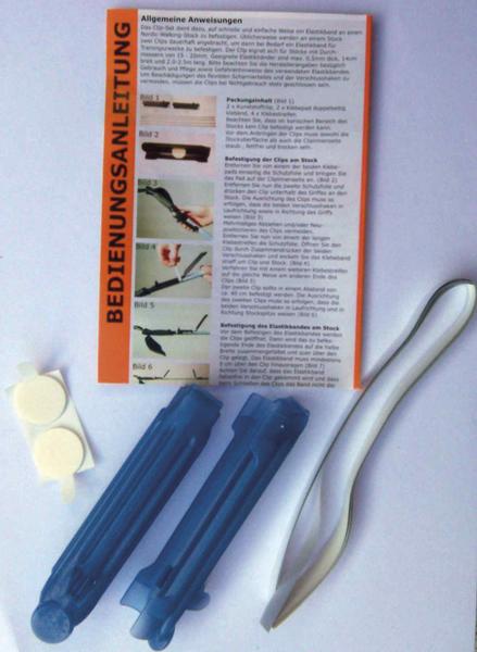 Die hochwertigen Nordic-Pump-Clips werden fest am Nordic-Walking-Stock angebracht. Durch die spezielle Form und dem extrem leichten Gewicht können die Clips langfristig belastet werden. Durch die Clips und einem Elastikband wird der Nordic-Walking-Stock zu einem sicheren, individuell einsetzbaren und vielseitigen Trainingsgerät, das überall und jederzeit ein hocheffektives Kräftigungstraining ermöglicht.