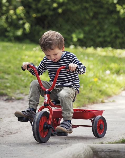 MINI Dreirad mit Wanne hat eine feststehende Ladefläche, mit der sich Spielzeug oder anderes Spielmaterial transportieren lässt.