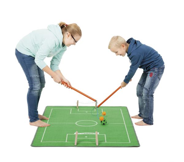 Fußball mal ganz anders: Tore werden mit Klettband auf dem Teppich befestigt und schon kann das Spiel beginnen. Jeder Spieler erhält einen (Golf-)Schläger, an dem ein Moosgummiball an einer Schnur befestigt ist. Dieser Ball dient als Schlagfläche und sollte ein Stück über dem Boden hängen. Mit einer Ausholbewegung des Stabes versucht jeder Spieler, mit seinem Moosgummiball den Spielball am Boden ins gegnerische Tor zu bewegen. Lieferung mit drei unterschiedlichen Spielbällen, die sich in Form, Größe, Gewicht und Spieleigenschaft unterscheiden, so dass unterschiedliche Schwierigkeitsgrade und Herausforderungen entstehen. Für 2 - 4 Spieler, für Kinder ab 4 Jahren geeignet.