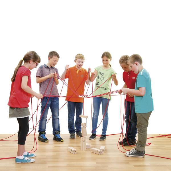Der Erzi® Teamturm ist so konzipiert, dass das Spiel schnell und einfach aufgebaut ist. Einfach die 6 Holzklötze und 12 Seile auspacken und schon kann es losgehen. Die liegenden Holzklötze sind mit Einkerbungen an der Oberseite versehen. Mit Hilfe eines Metallbügels, der mit den Seilen verbunden ist, müssen die Klötze aufgestellt und gestapelt werden. Jeder Zug und jede Bewegung erfordern eine sorgfältige Koordination und Absprache innerhalb des Teams. Das Ziel des Spiels ist es, gemeinsam einen Turm zu errichten! Neben einer Menge Spaß fördert der Erzi® Teamturm auch die Motorik und Kommunikationsfähigkeiten der Spieler. Bestellen Sie noch heute Ihren neuen Erzi® Teamturm und erweitern Sie Ihre Teambuilding-Spiele.