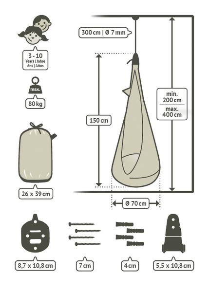 Für die Aufhängung benötigen Sie einen Aufhängepunkt, der sich an der Zimmerdecke, einem Ast oder einem Balken befindet. Für die Anbringung der Hängehöhle JOKI ist eine Aufhängehöhe von mindestens 200 cm nötig. Befindet sich die Aufhängung an einem höheren Punkt, kann der Hängestuhl mit einem Seil verlängert werden.
