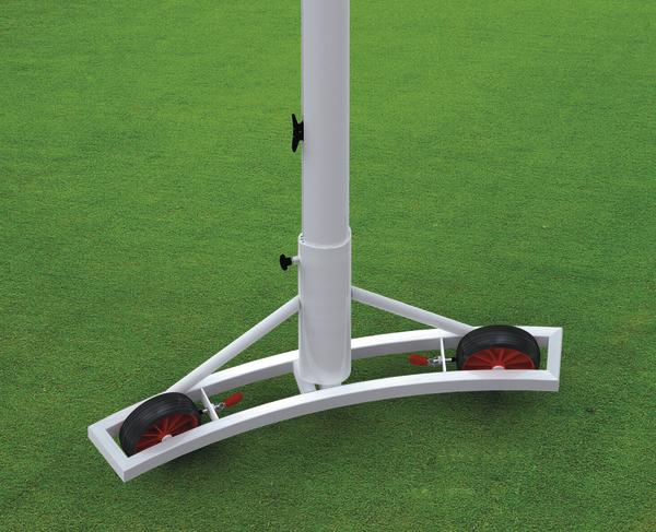 IAAF-Zertifikat E-07-0481. Anlage bestehend aus 10 Pfosten (ovale Aluminium-Profile 98 x 148 mm), im unteren Bereich verstärkt, in Bodenhülsen stehend. Anlage beinhaltet stufenlos verstellbare Schwenkklappen mit Laufrollen und Feststellern. Lieferung einschl. Bodenhülsen, jedoch ohne Hochziehvorrichtung für das Schutznetz, Deckeln für Bodenhülsen, Netz und Sandsäcke.