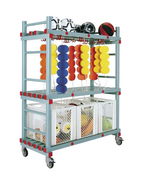 aus Kunststoff für eine vielseitige Art und Weise Schwimmhilfen, Lehrmittel und Spiele zu lagern. Oberer Boden mit 21 doppelten Kunststoffhaken und mit 2 Seitenteilen 15 cm hoch versehen. Zwischenraum zwischen den 2 weiteren Böden von unten nach oben 55 und 70 cm. Fahrbar mit 4 Kunststoff-Schwenkrollen, von denen 2 gebremst sind.