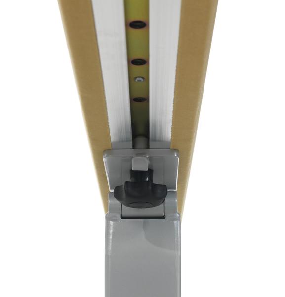 Die Höhe lässt sich schnell und einfach von 75 bis 125 cm in 5 cm Schritten einstellen. So ist gewährleistet, dass die individuell benötigte Höhe für den einzelnen Turner bereitgestellt werden kann. Durch die neuartige Form des Querschnitts wirkt der Schwebebalken optisch breiter.